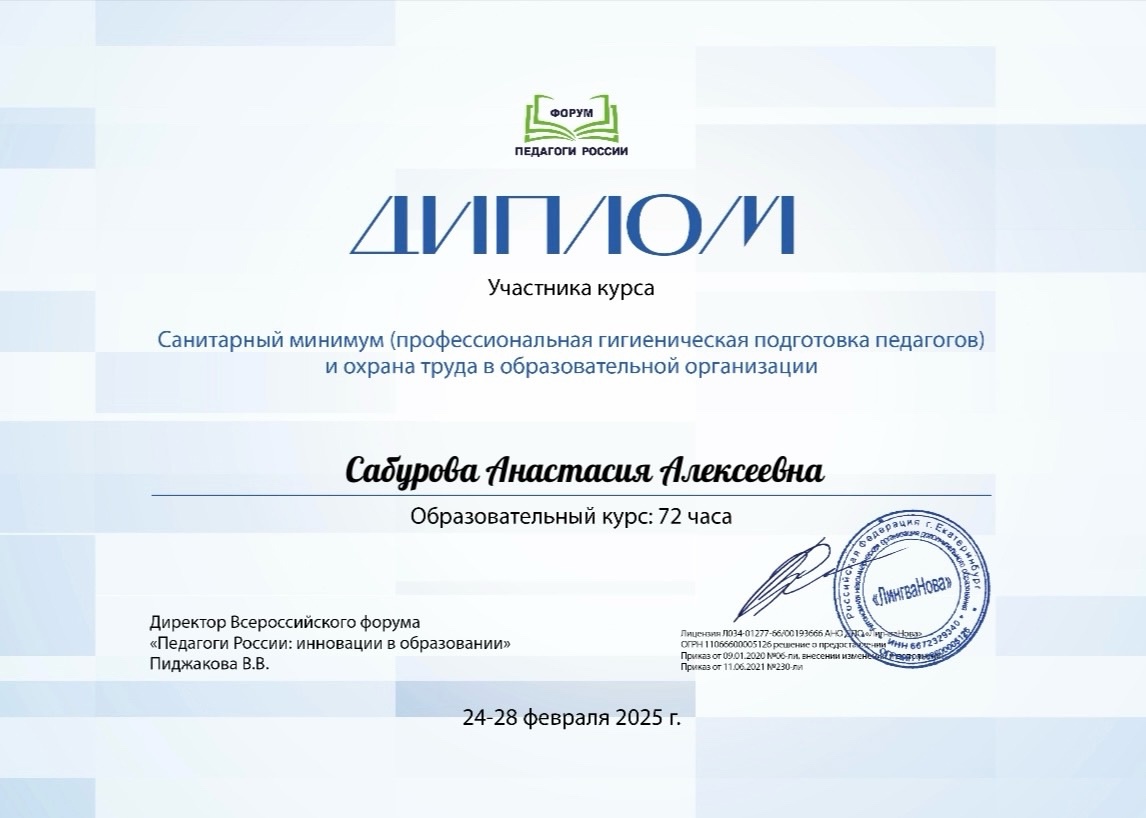 «Санитарный минимум (профессиональная гигиеническая подготовка педагогов) и охрана труда в образовательной организации)», 72 ч., 2025 г.