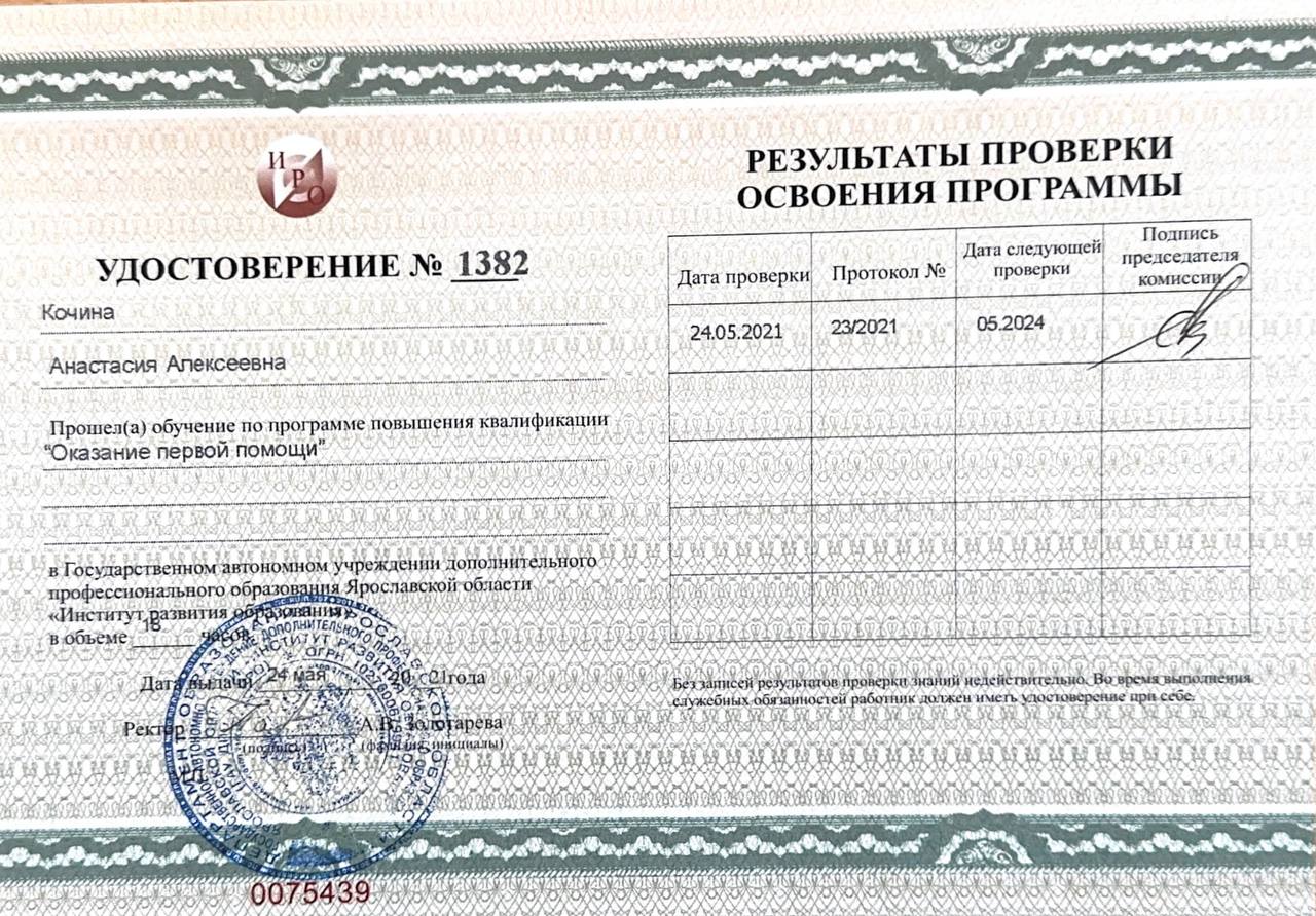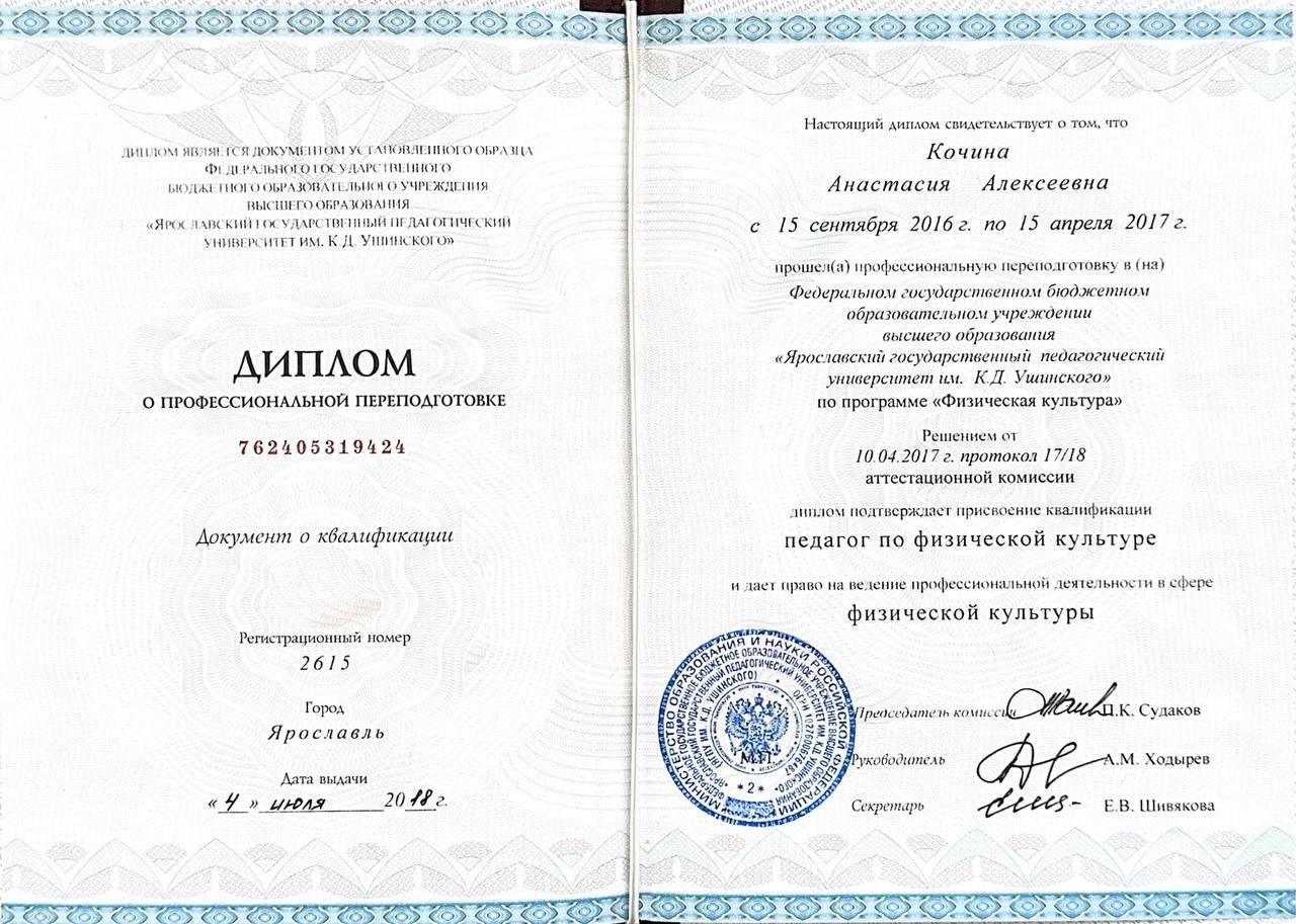 Профессиональная переподготовка Федеральное государственное бюджетное образовательное учреждение высшего образования «Ярославский государственный педагогический университет им. К.Д. Ушинского», Педагог по физической культуре, 1004 ч., 2018 г.