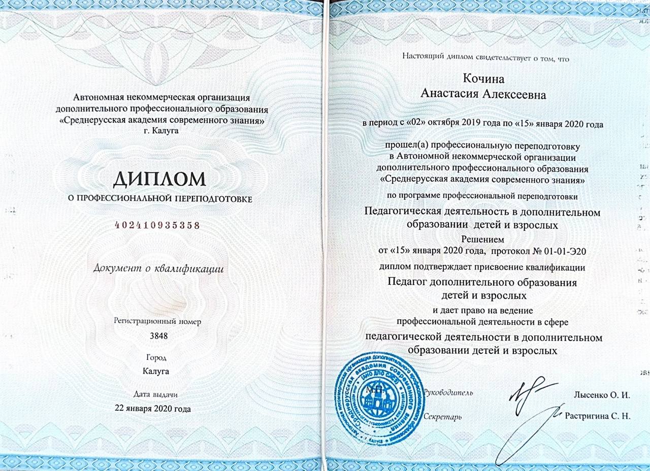 Профессиональная переподготовка Автономная некоммерческая организация дополнительного профессионального образования «Среднерусская академия современного знания», г. Калуга, Педагог дополнительного образования для детей и взрослых, 520 ч., 2020 г.