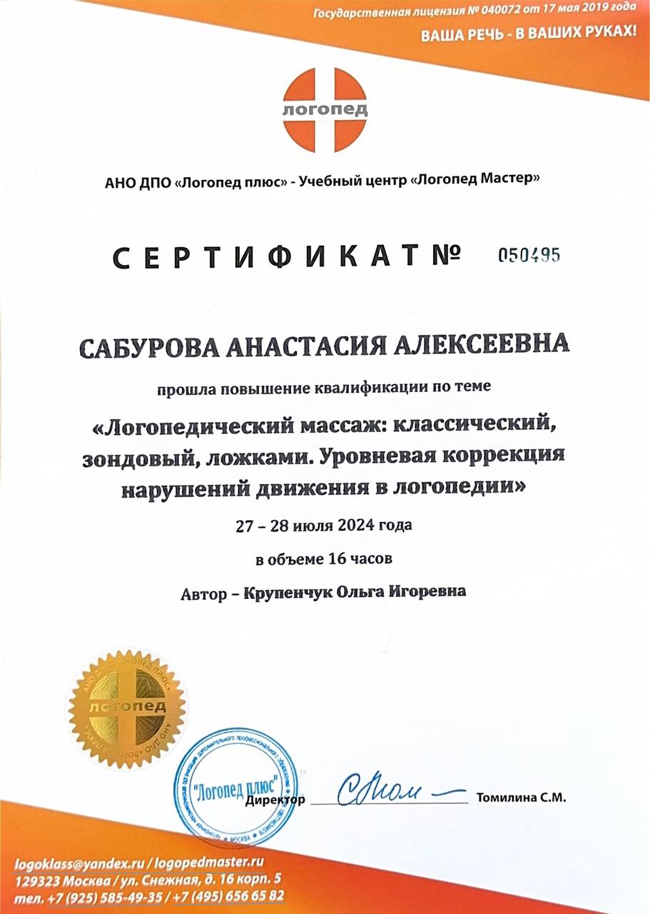 «Логопедический массаж: зондовый, ложками. Уровневая коррекция нарушений движения в логопедии», 16 ч., 2024 г.