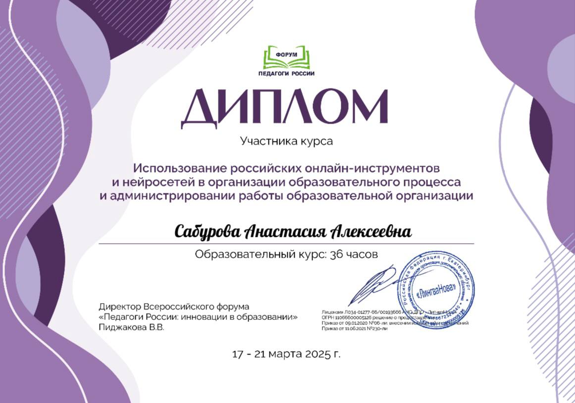 «Использование российских онлайн-инструментов и нейросетей в организации образовательного процесса и администрировании работы образовательной организации», 36 ч., 2025 г.